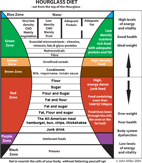 The Hourglass Diet model, good food at the top, junk food, intolerant